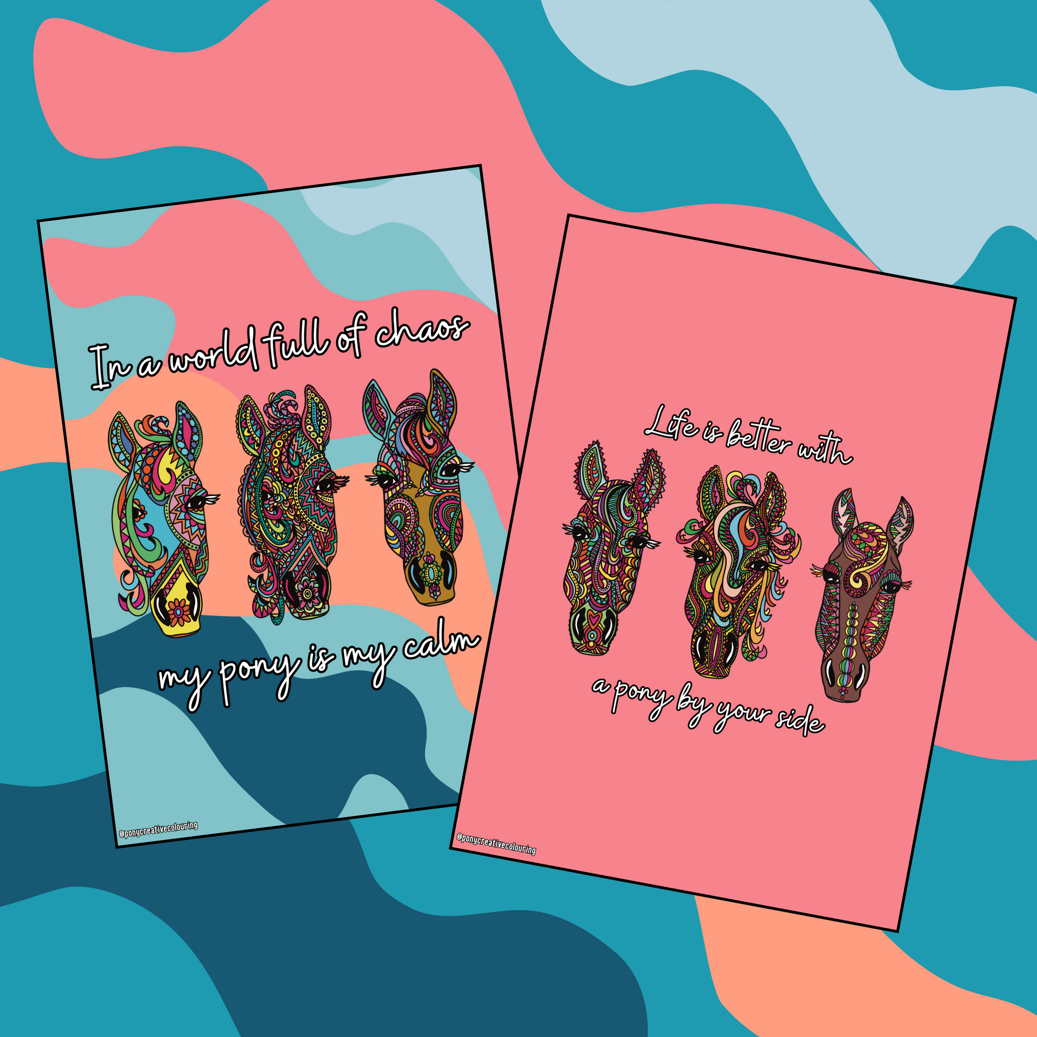 BRAND NEW Pony Head Mandala Print Set – 2 unique designs bursting with bright colours and whimsical charm! PLUS You will receive another set of 2 with white backrgound, to conserve ink should you be printing at home.